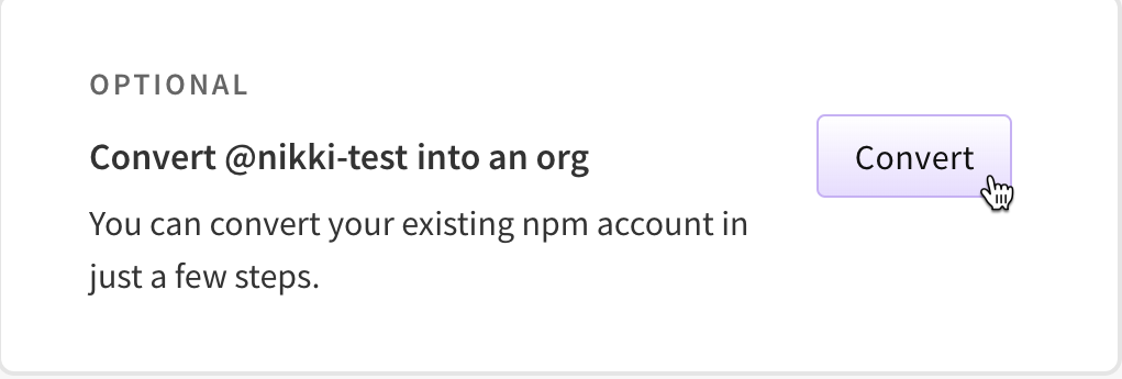 Note: Once your old user account has been converted to an organization, you will no longer be able to sign in to npm with your old user account.